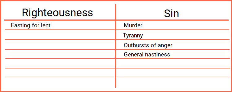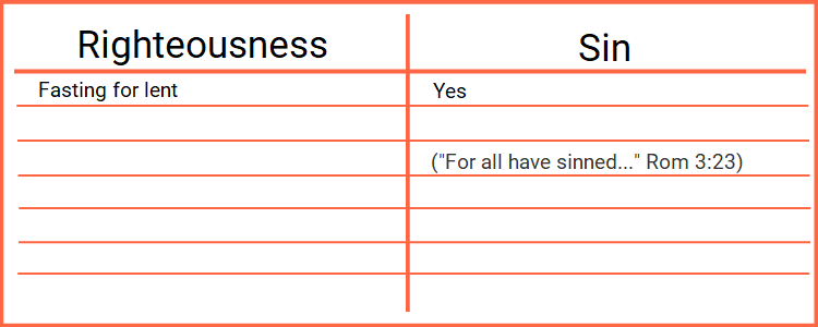 The sin side of the ledger heavily outweighs the righteousness side. The problem isn’t just that Ivan has committed sins that are far worse than any of the sins that Basil has committed. As Paul wrote, “for all have sinned [not just Ivan the Terrible!] and fall short of the glory of God” (Rom 3:23). Ivan’s problem isn’t that his life is worse than Basil’s. Basil is also a sinner, as all men are. Ivan’s problem isn’t that his sins are too extreme and separate him from God. His problem is that any sin he has ever committed, no matter if it’s a great or a small sin, brings him short of the glory of God. It’s not a matter of how much he has sinned, but whether or not he has sinned. This is a yes or no question, and since he has sinned, as we all have, his sin side of the ledger could be re-written like this: