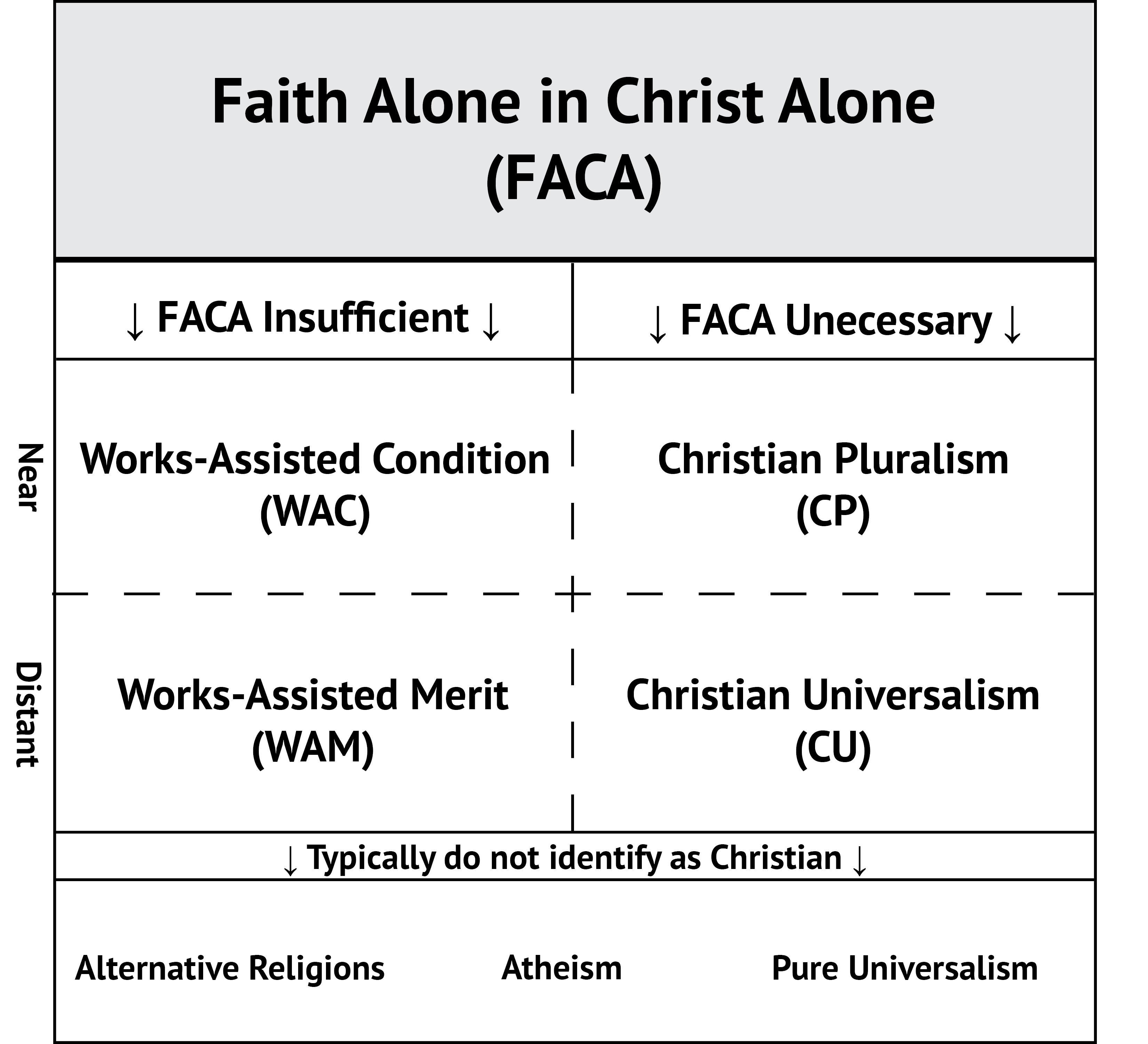 Our soteriological perspective can be described as Faith Alone in Christ Alone (FACA). This view is not held by consensus but rather is derived biblically. Many who fall under the umbrella of Christendom reject our perspective, typically because they deem FACA either to be insufficient or unnecessary to varying degrees, and outside of Christendom are those who reject the Gospel for even more reasons. The following chart shows the relation of FACA to other perspectives:
